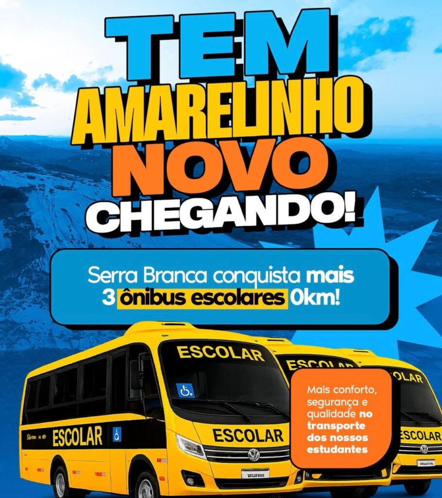 O prefeito Alexandre destacou a importância desse reforço para a rede municipal: “É com grande alegria que anunciamos mais essa conquista para a educação de Serra Branca. Estamos falando de três ônibus escolares zero km, que chegam para trazer mais conforto, segurança e qualidade ao transporte dos nossos alunos. Seguimos avançando, juntos, em um novo tempo para nossa educação.”